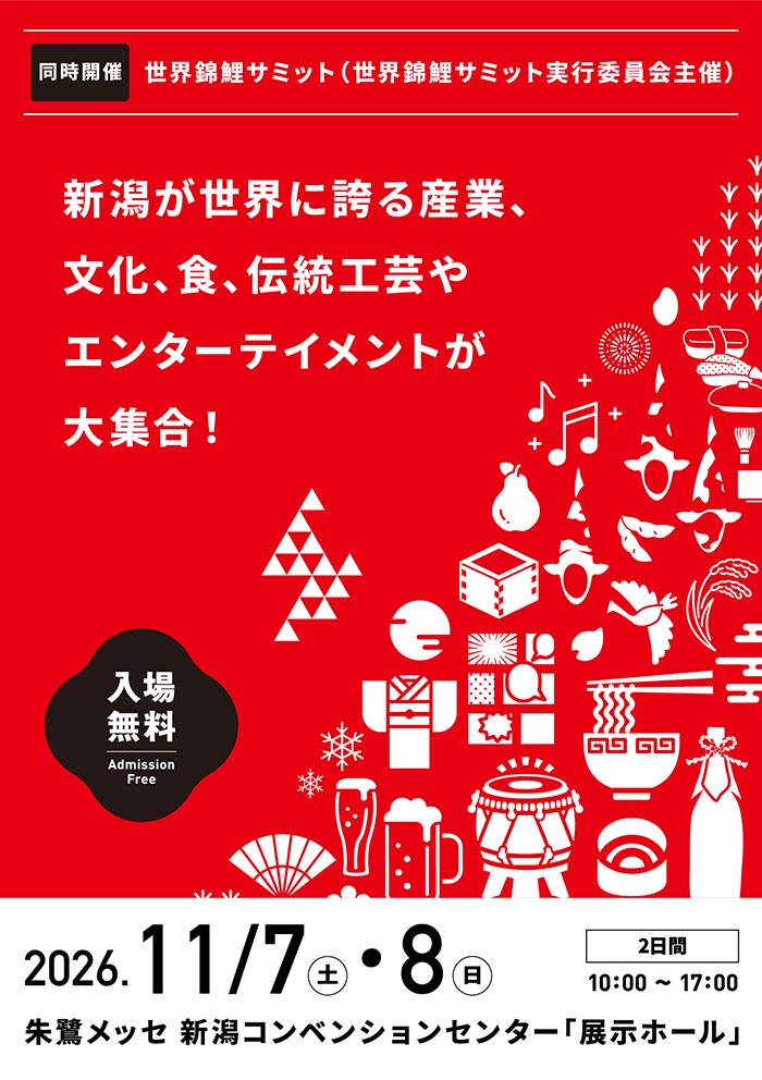| 後援: | 内閣府知的財産戦略推進事務局、外務省、農林水産省、経済産業省、観光庁、新潟県、新潟市、三条市、燕市、弥彦村、加茂市、長岡市、小千谷市、魚沼市、南魚沼市、十日町市、上越市、佐渡市、日本貿易振興機構(ジェトロ)新潟貿易情報センター、一般社団法人新潟県商工会議所連合会、新潟県商工会連合会、新潟県中小企業団体中央会、一般社団法人新潟県中小企業家同友会、公益財団法人にいがた産業創造機構、新潟日報社、毎日新聞新潟支局、朝日新聞新潟総局、読売新聞新潟支局、産経新聞新潟支局、日本経済新聞社新潟支局、共同通信社新潟支局、 時事通信社新潟支局、NHK 新潟放送局、BSN 新潟放送、NST新潟総合テレビ、TeNY テレビ新潟、UX 新潟テレビ21、FM 新潟77.5、FM KENTO |